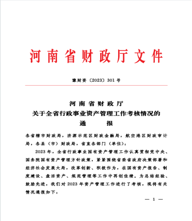 近日,河南省财政厅印发《河南省财政厅关于全省行政事业资产管理工作考核情况的通报》(豫财资〔2023〕301号),在2023年度行政事业资产管理工作考核中,我校受到通报表彰。全省77个省直部门所属单位的郑州大学、河南大学等21所高校受到省财政厅通报表彰。